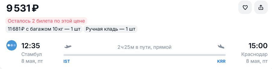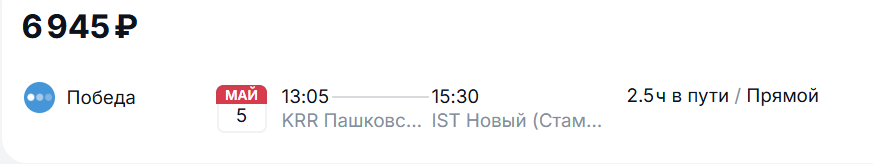 Еще одно направление для путешественников с отгулами — Стамбул. 5 мая перелет туда обойдется в 6 945 рублей у «Победы». Вылет в 13:05, прилет в 15:30. Обратные рейсы 8 или 9 мая стоят от 9 500 рублей, а на 10-11 мая цены возрастают до 15 тысяч рублей.