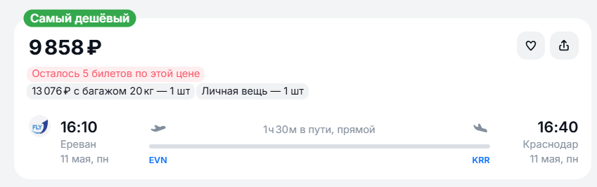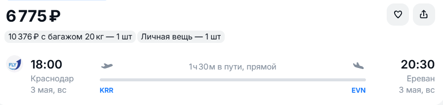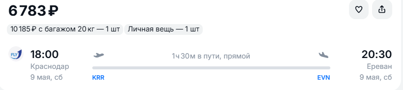 В столицу Армении можно отправиться 3 или 9 мая. Вылет из Краснодара в 18:00, прилет в 20:30. Цена билета без багажа составляет около 6 800 рублей у перевозчика FlyOne Armenia. Обратный перелет 11 мая обойдется в 9 858 рублей: вылет в 16:10, прилет в 16:40.