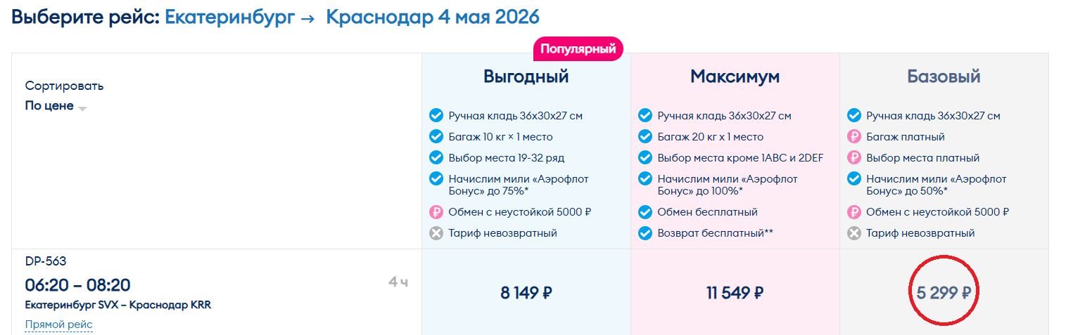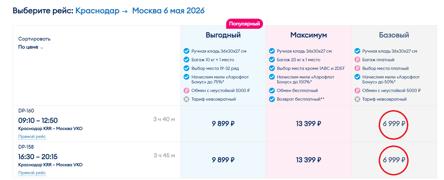 Этот вариант подойдет тем, кто готов взять отгулы. 6 мая билет из Краснодара в столицу без багажа стоит 6 999 рублей у авиакомпании «Победа». Доступны рейсы в 09:10 и 16:30, время в пути — 3 часа 40 минут. Обратные перелеты с 9 по 11 мая оцениваются примерно в 8 800 рублей: вылет из Москвы в 07:35, прибытие в Краснодар в 11:35.